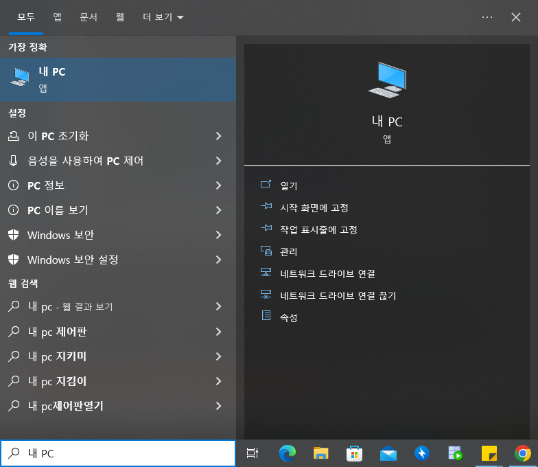 하단 검색창에 내 PC 입력후 [마우스 오른쪽 - 속성] 클릭