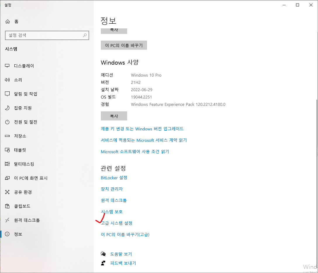 고급 시스템 설정 클릭