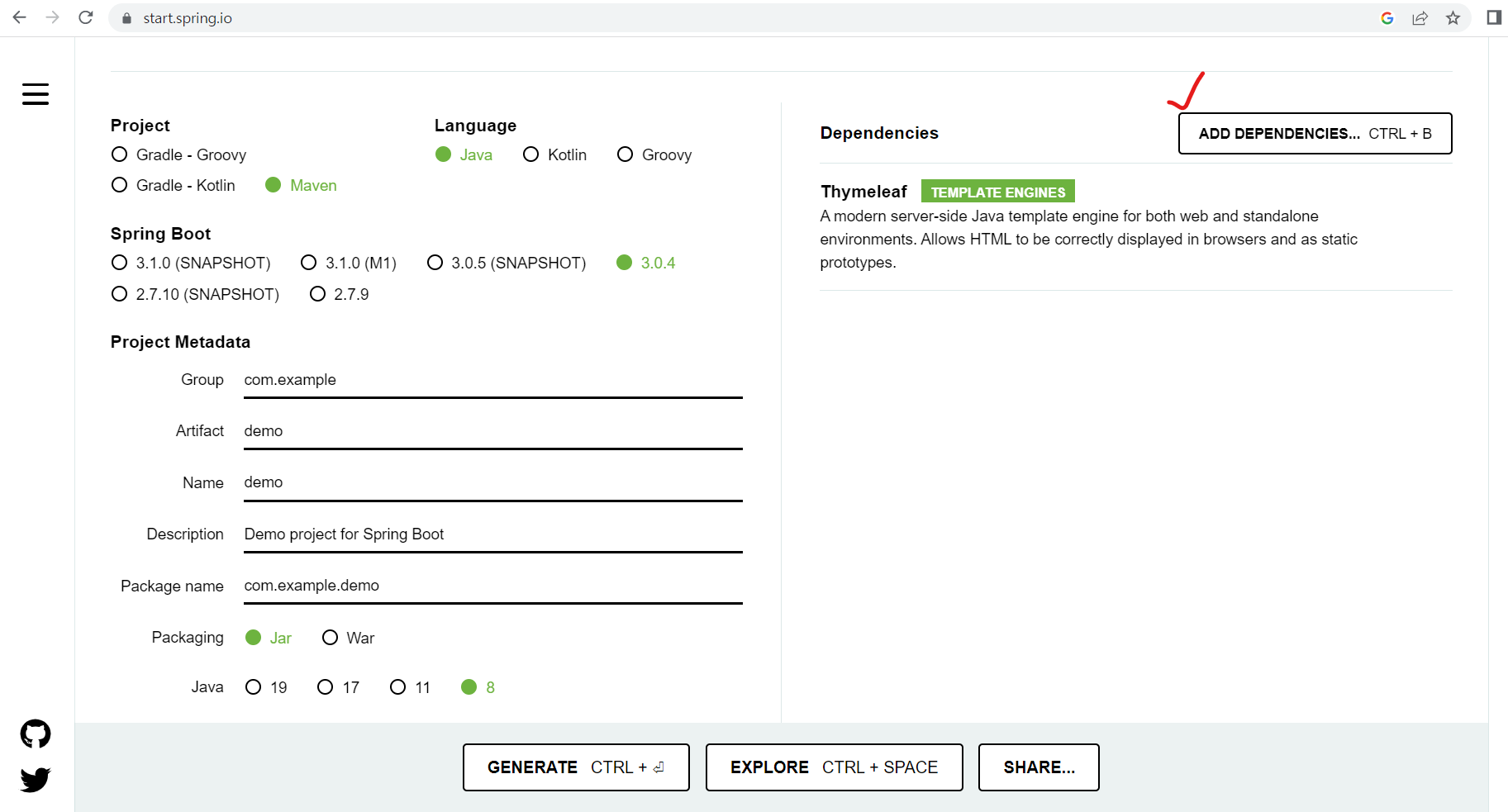 스프링부트 생성 페이지에 가서 ADD DEPENDENCIES... 누른다.