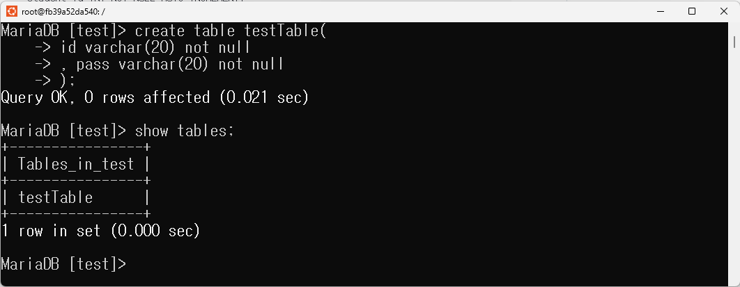 test 라는 데이터베이스가 생성된 것을 확인하실 수 있습니다.