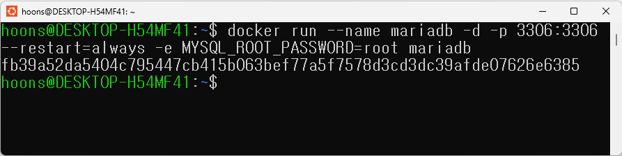 docker run --name mariadb -d -p 3306:3306 --restart=always -e SQL_ROOT_PASSWORD=root mariadb