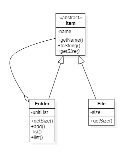 Item 추상클래스는 기본적인 것만제공하고 나머지는 Folder 와 File 클래스 에서 구현합니다.