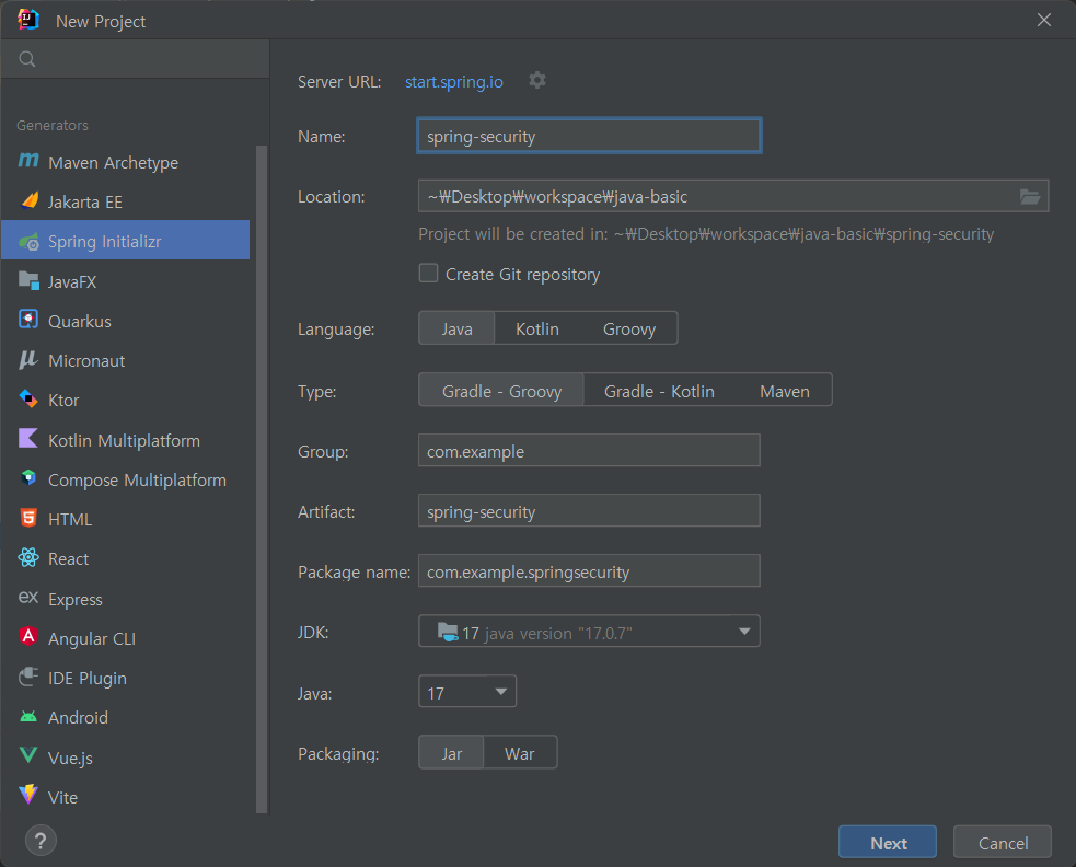 빌드 툴은 Gradle 을 사용하겠습니다. 이후 Next